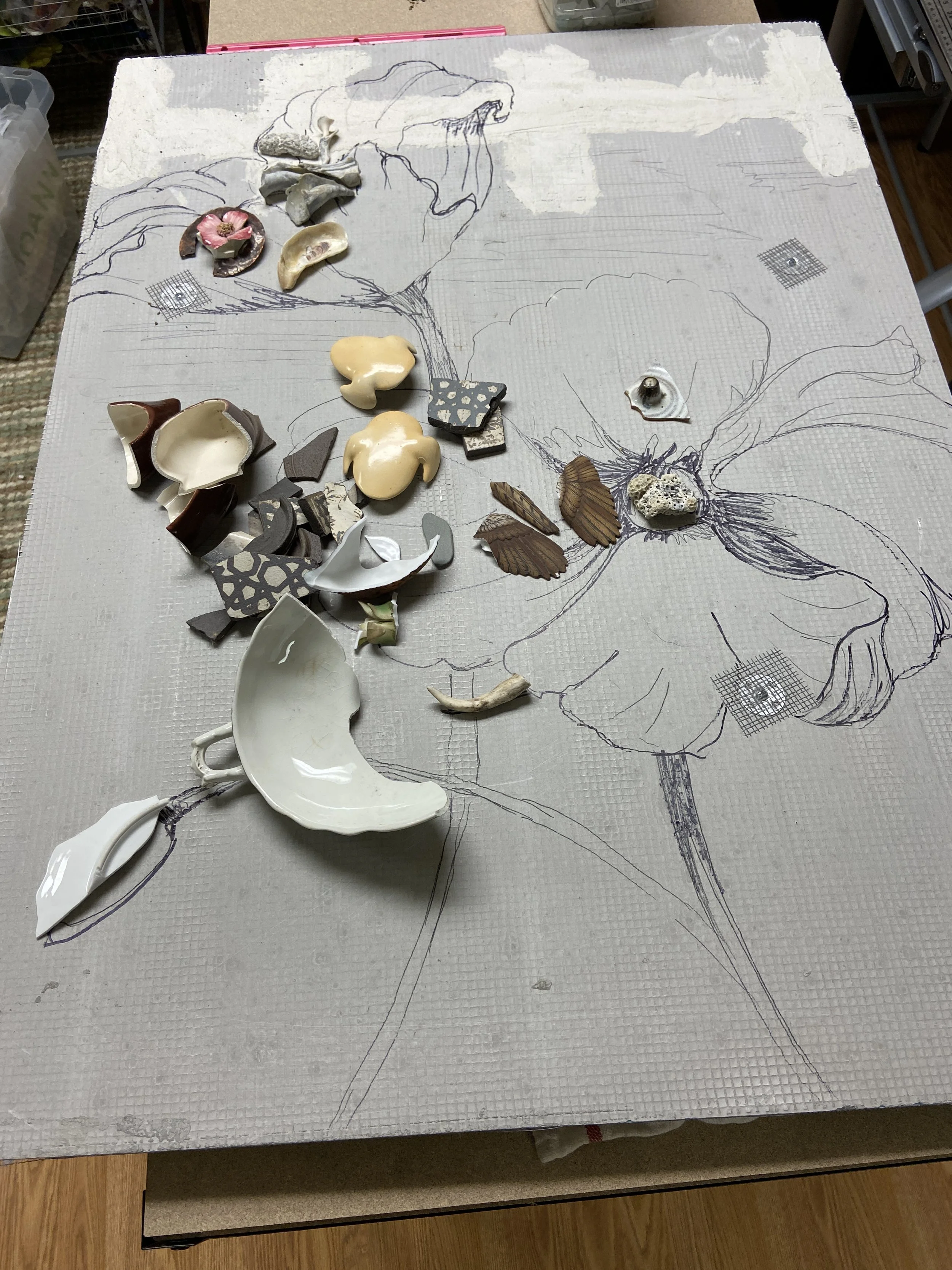 This piece was challenging, to work with such a limited palette while using dinner plates as my paint. I’m sure I wiped out my stock of white dishes, but I’m thrilled with the results and loved getting a picture of it hanging in its new home.